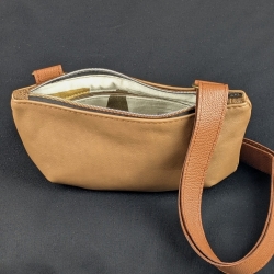 Juste assez grand pour y glisser un téléphone, un étui souple à lunettes, un porte monnaie, paquet de mouchoirs et petit nécessaire féminin. Une poche zippée permet d'y glisser les papiers.
